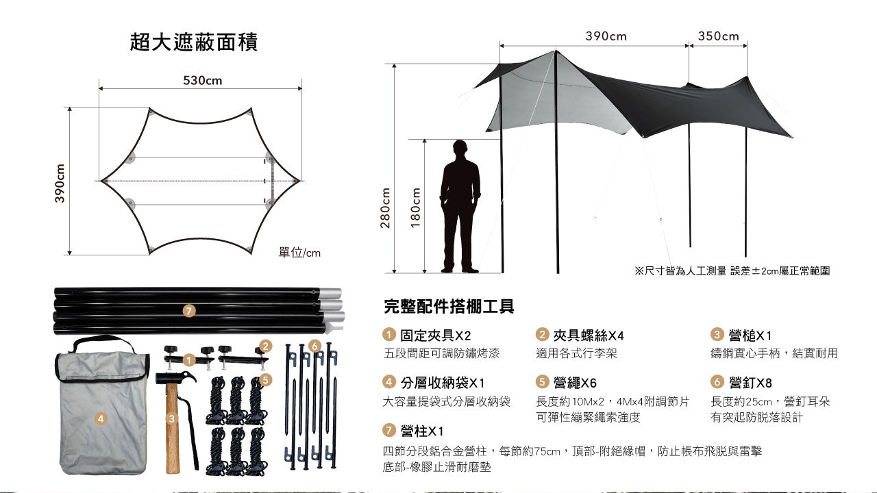 (工具包:含營釘*8 / 固定繩*6 / 營槌*1/固定夾具*2 /螺絲*4)