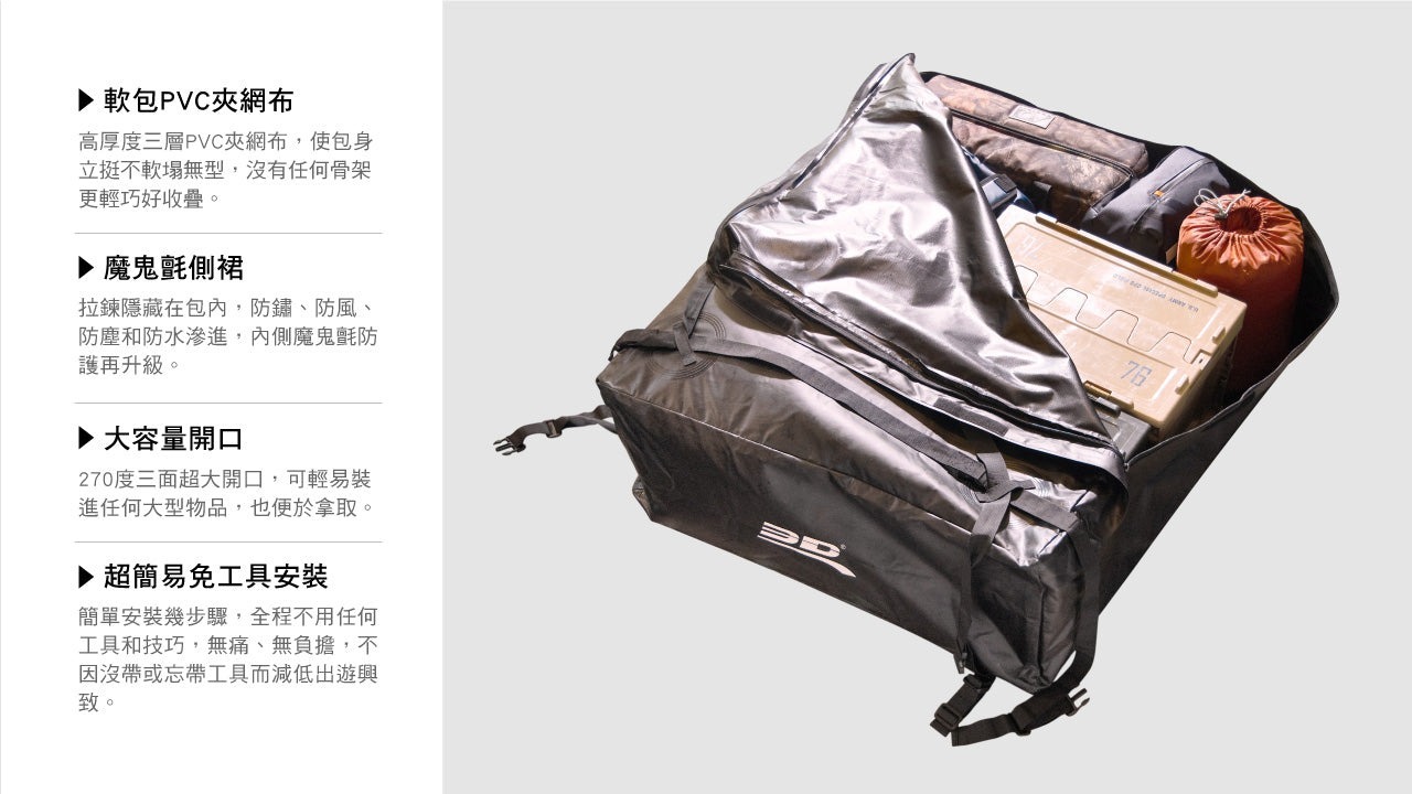 聰明善用車頂空間,輕易更換場景,完美的移動不再是奢求,軟包設計輕鬆裝更多,平時收納也不佔空間