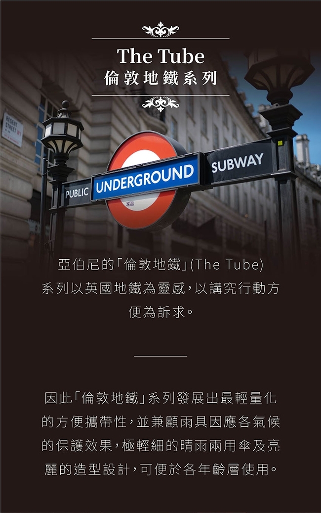 設計師引用倫敦地鐵概念創造了TubeAuto。握把設計成管路的連接,巧妙的如同地鐵隧道外框架,開傘按鈕則採用雙向箭頭圖案,就像地鐵車門開關的按鈕一樣;撇開了以往對自動傘沉重的觀念,適合任何人皆能輕易攜帶,即使輕,也不失去機能還有時尚,在忙碌的社會裡,能快速輕便的因應各種天氣,也能在庸庸碌碌的人群中,輕盈、順暢地抵達每個人的目的地。▍產品特色 ▍