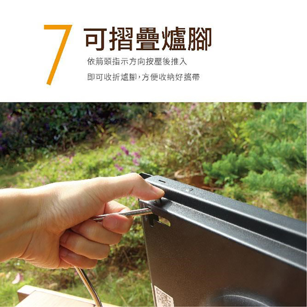 ✔可摺疊式爐腳,按箭頭方向按壓後推入,即可收折爐架,收納方便好攜帶