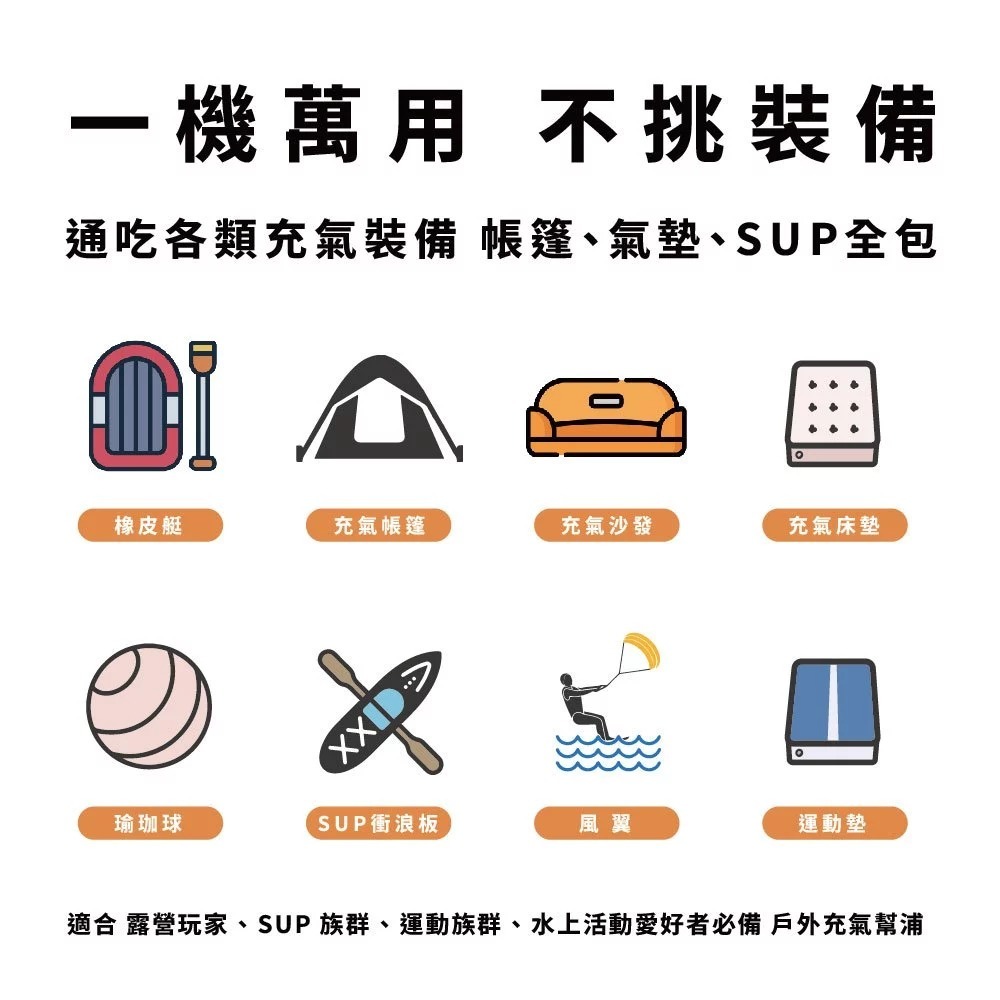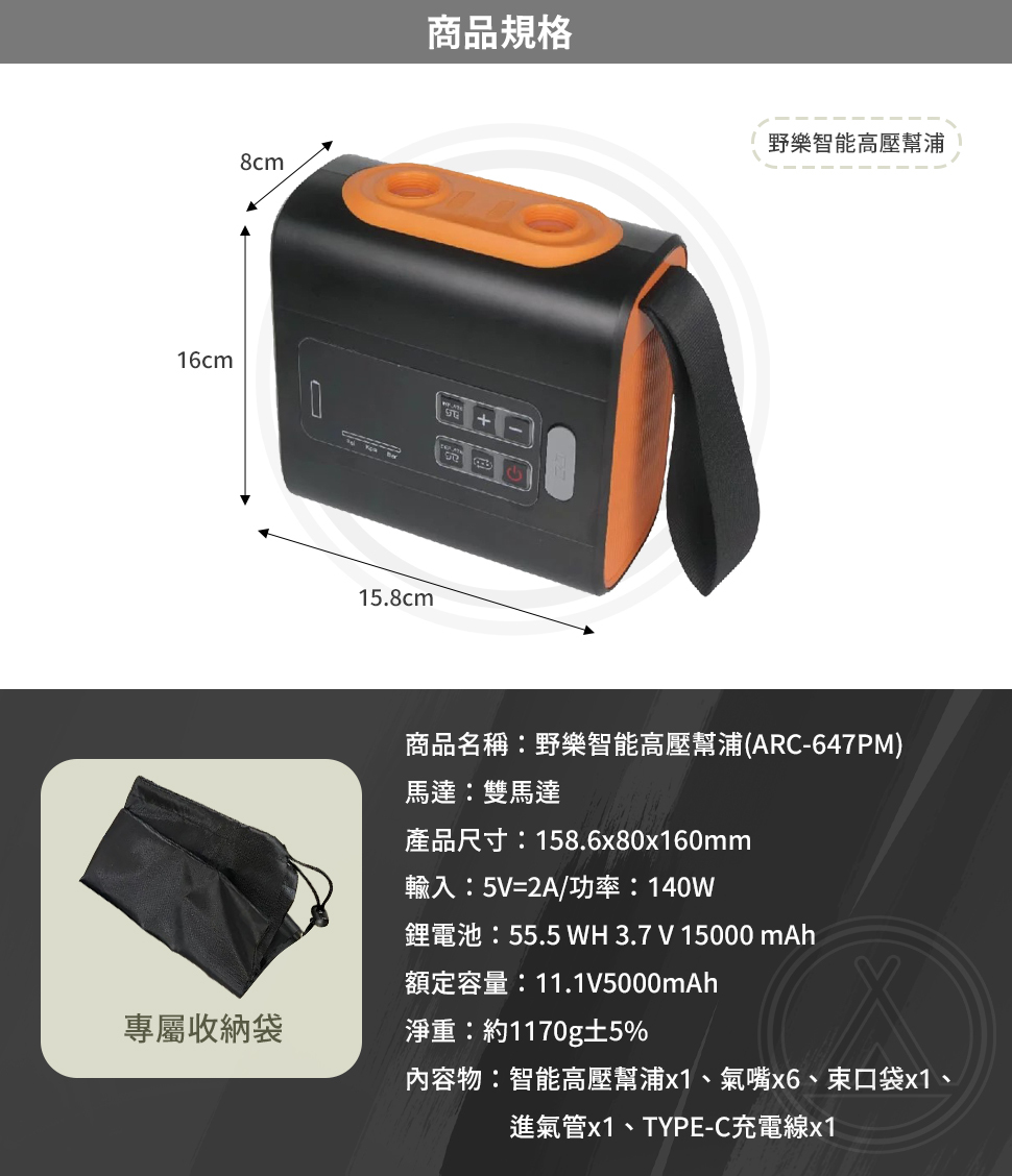 內容物:智能高壓幫浦×1、氣嘴×6、進氣管×1、TYPE-C充電線×1、束口收納袋×1