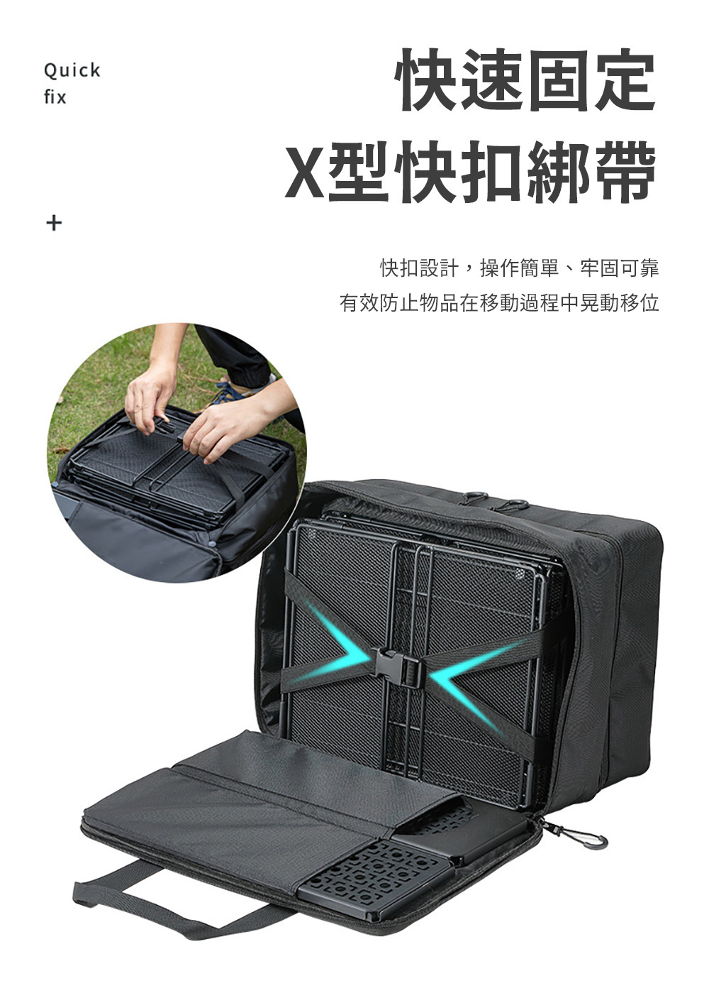 ▶︎X型快扣綁帶,有效防止物品晃動移位