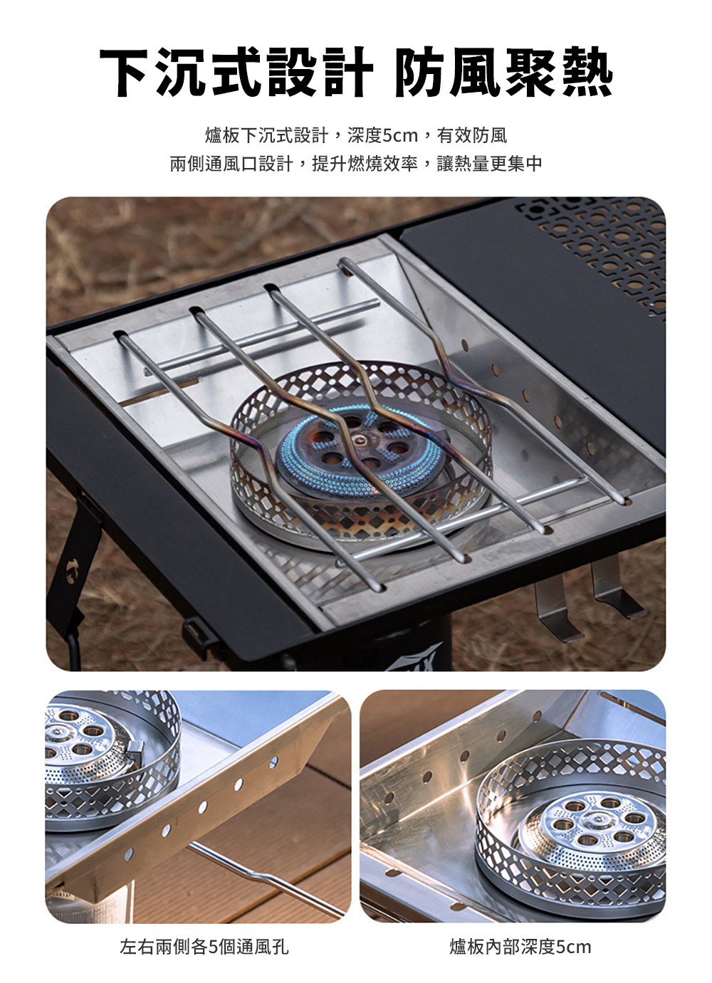 ■ 下沉式爐板設計,集中聚熱並提升擋風效果