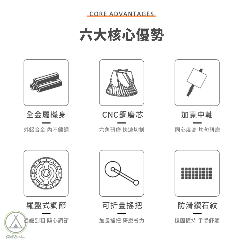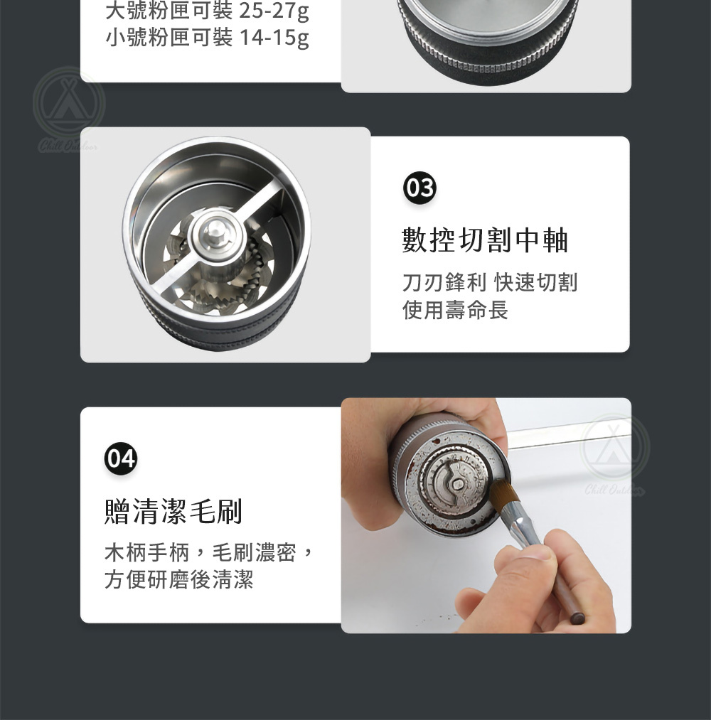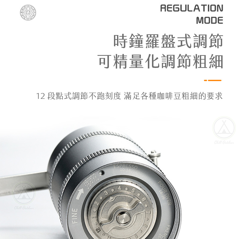 ✔時鐘羅盤式粗細調節,12段點式調節不跑刻度,滿足各種咖啡豆粗細的要求