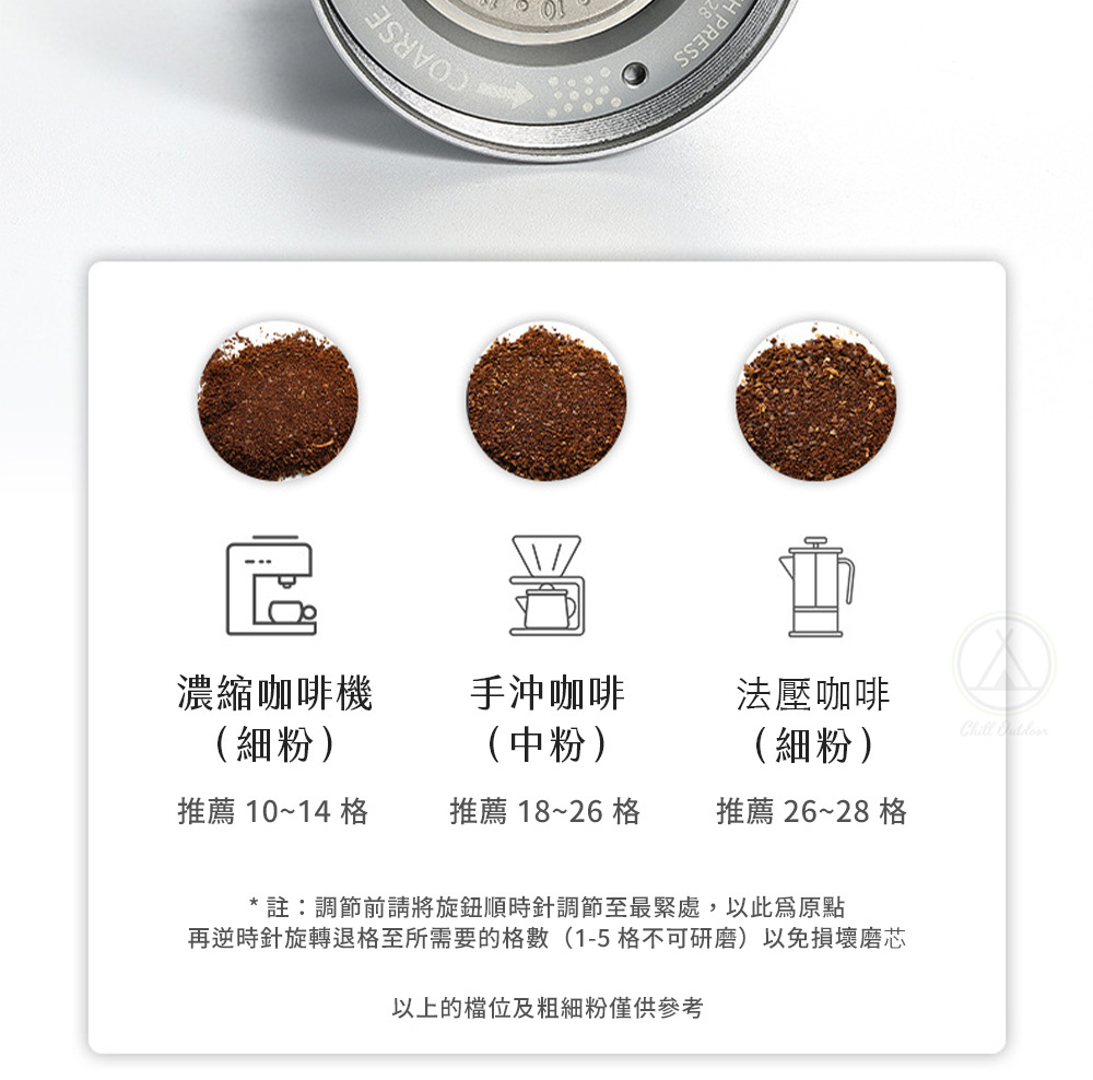 1-5格不可研磨,以免損壞磨芯,以上檔位及粗細粉僅供參考