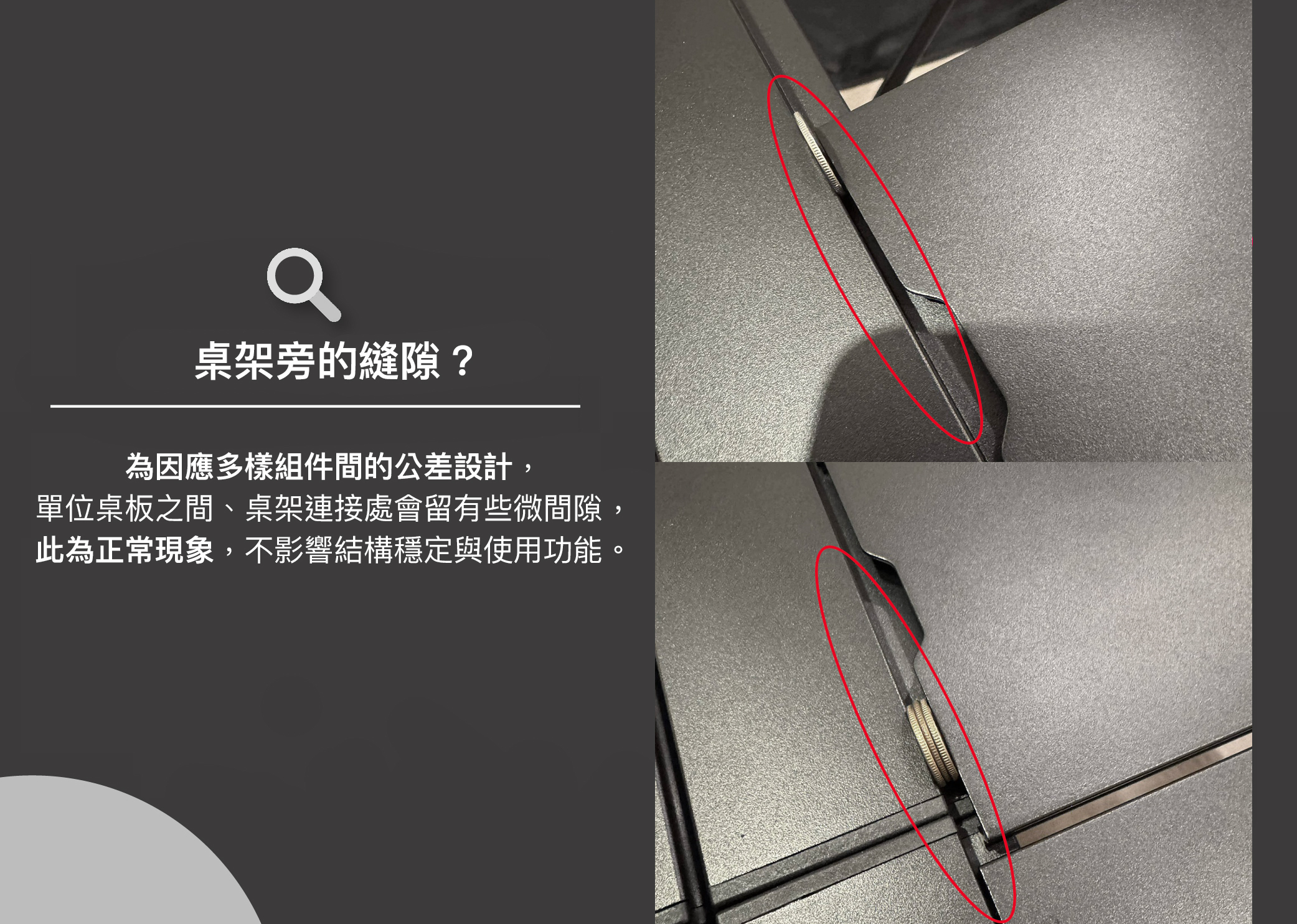 ⚠️為因應多樣組件間的公差設計,單位桌板彼此之間,以及與桌架連接處會留有些微間隙,此為正常現象,不影響結構穩定與使用功能。