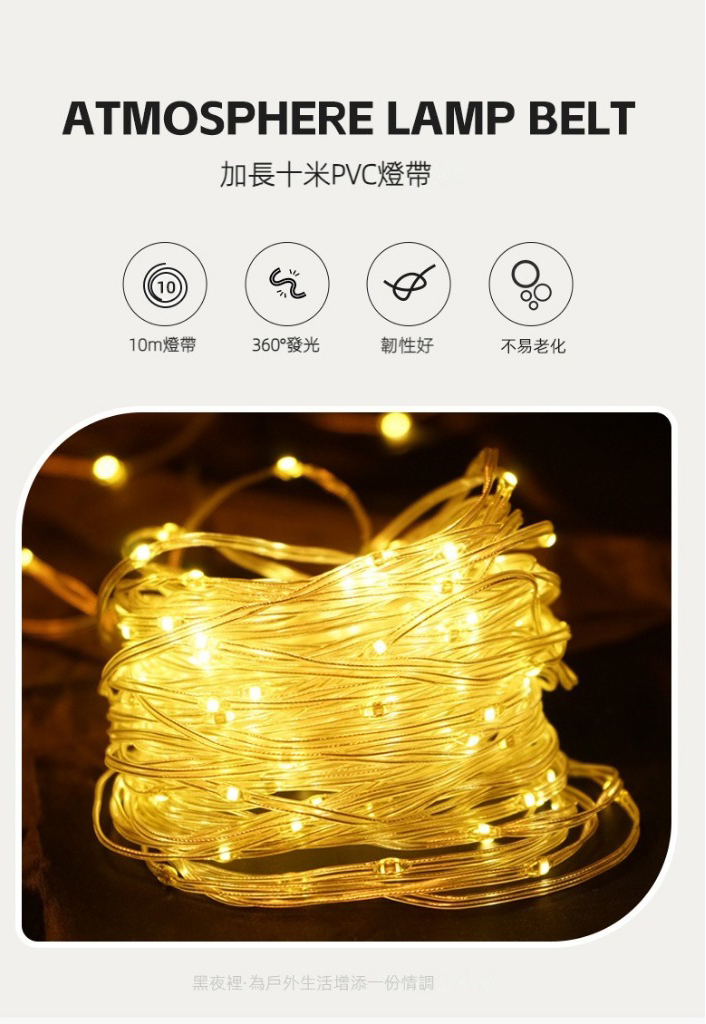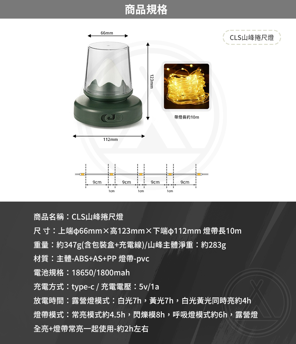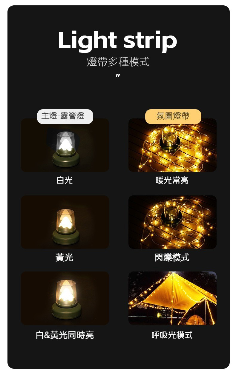 🔹燈帶模式:(常亮模式) 約4.5h、(閃爍模)約8h、(呼吸燈模式)約6h、露營燈全亮+燈帶常亮一起使用-約2h左右