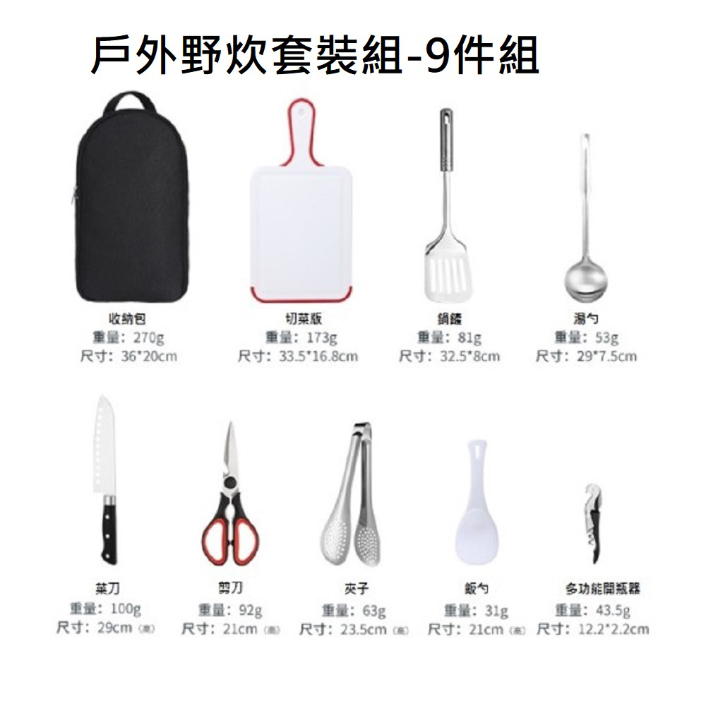 ✔內容物:砧板、飯勺、夾子、鍋鏟、湯勺、菜刀、剪刀、多功能開瓶器、收納袋