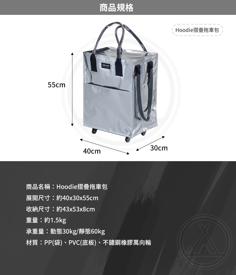 🔹�材質:PP(袋)、PVC(底板)、不鏽鋼橡膠萬向輪