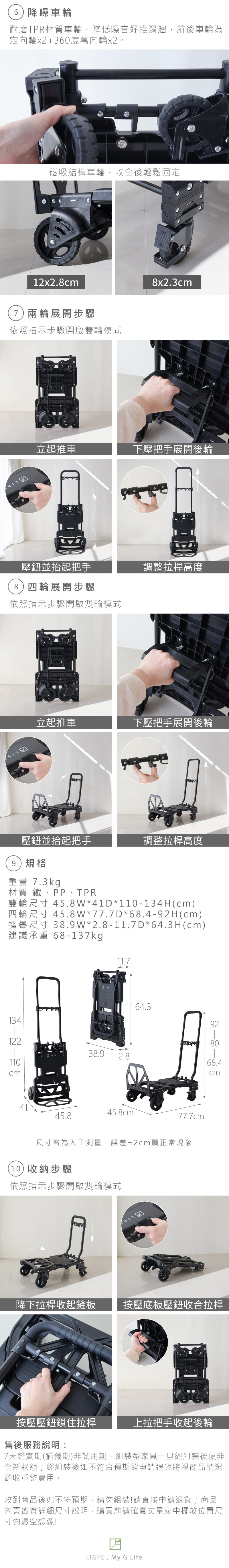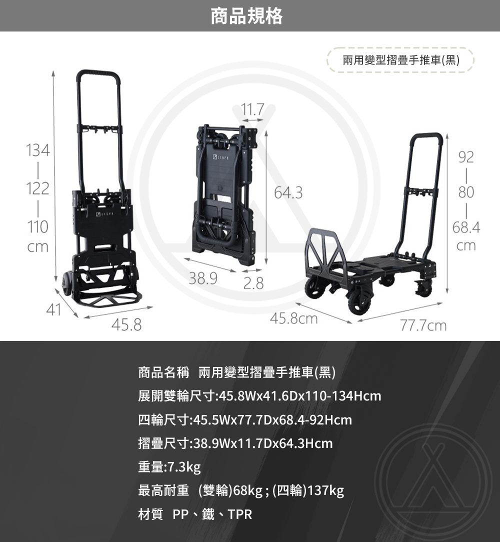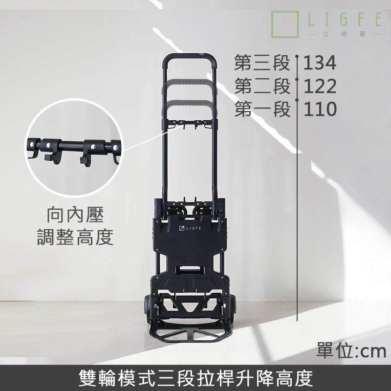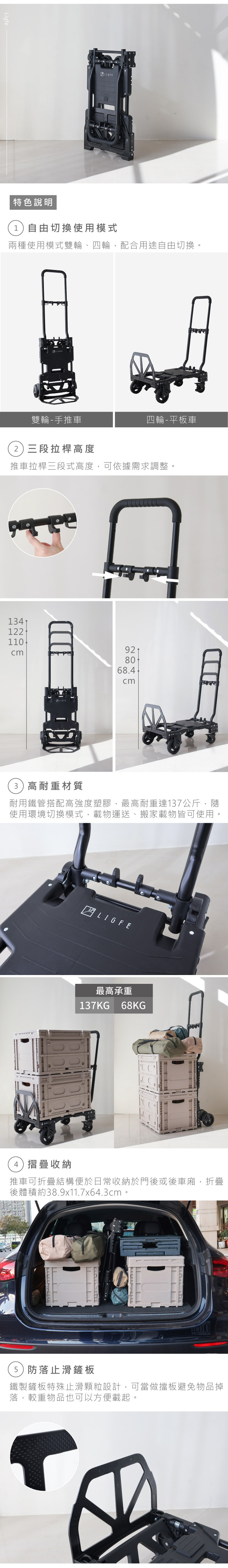 兩用多型態推車,可自由切換兩輪/四輪模式,獨家配色款,最高耐重達137公斤,居家搬運、工作載貨皆適合!
