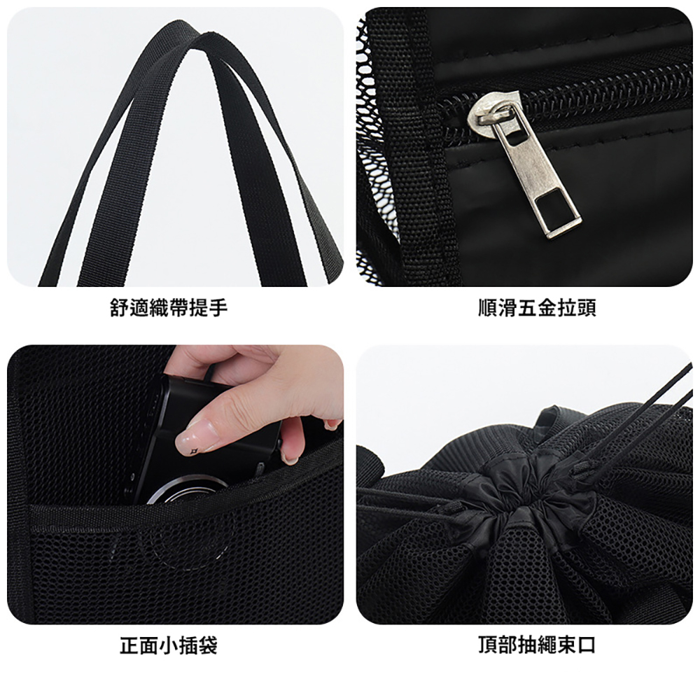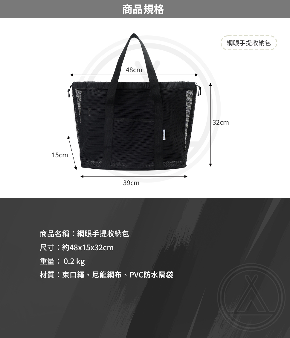 網眼手提收納包,透氣網布設計方便辨識內容物,輕便耐用、攜帶方便,適合收納衣物、鞋子、露營裝備或日常用品,保持整潔有序。