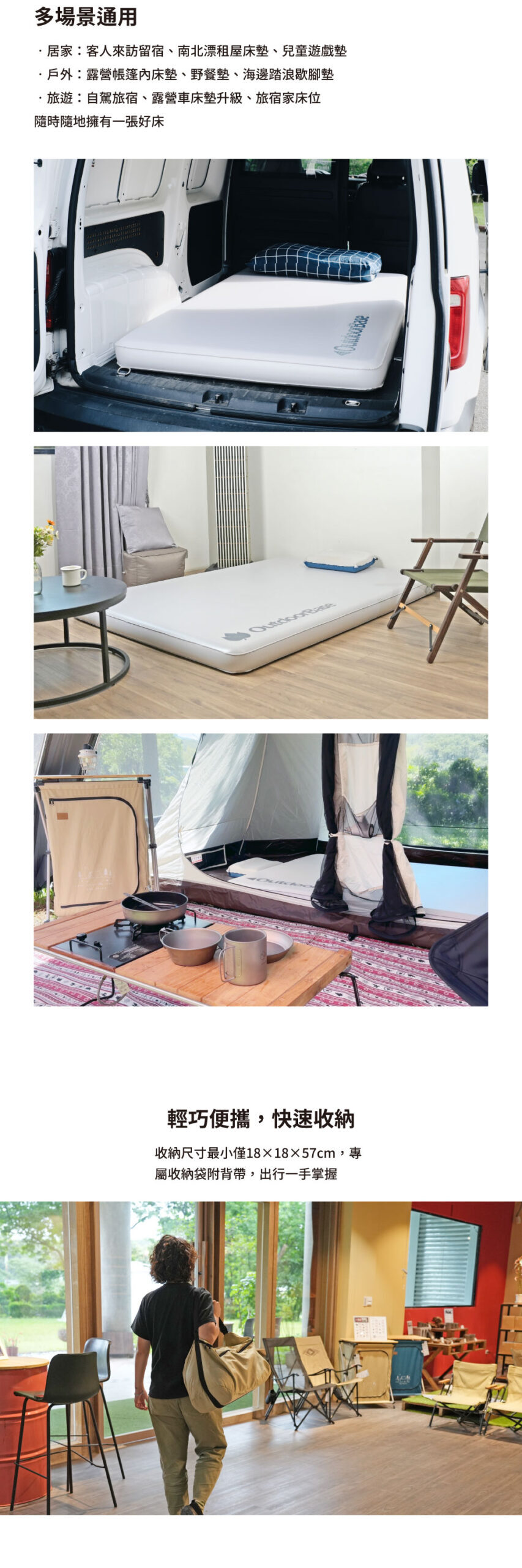 雙層強化床面,抓地力強,戶外使用也不易磨損。