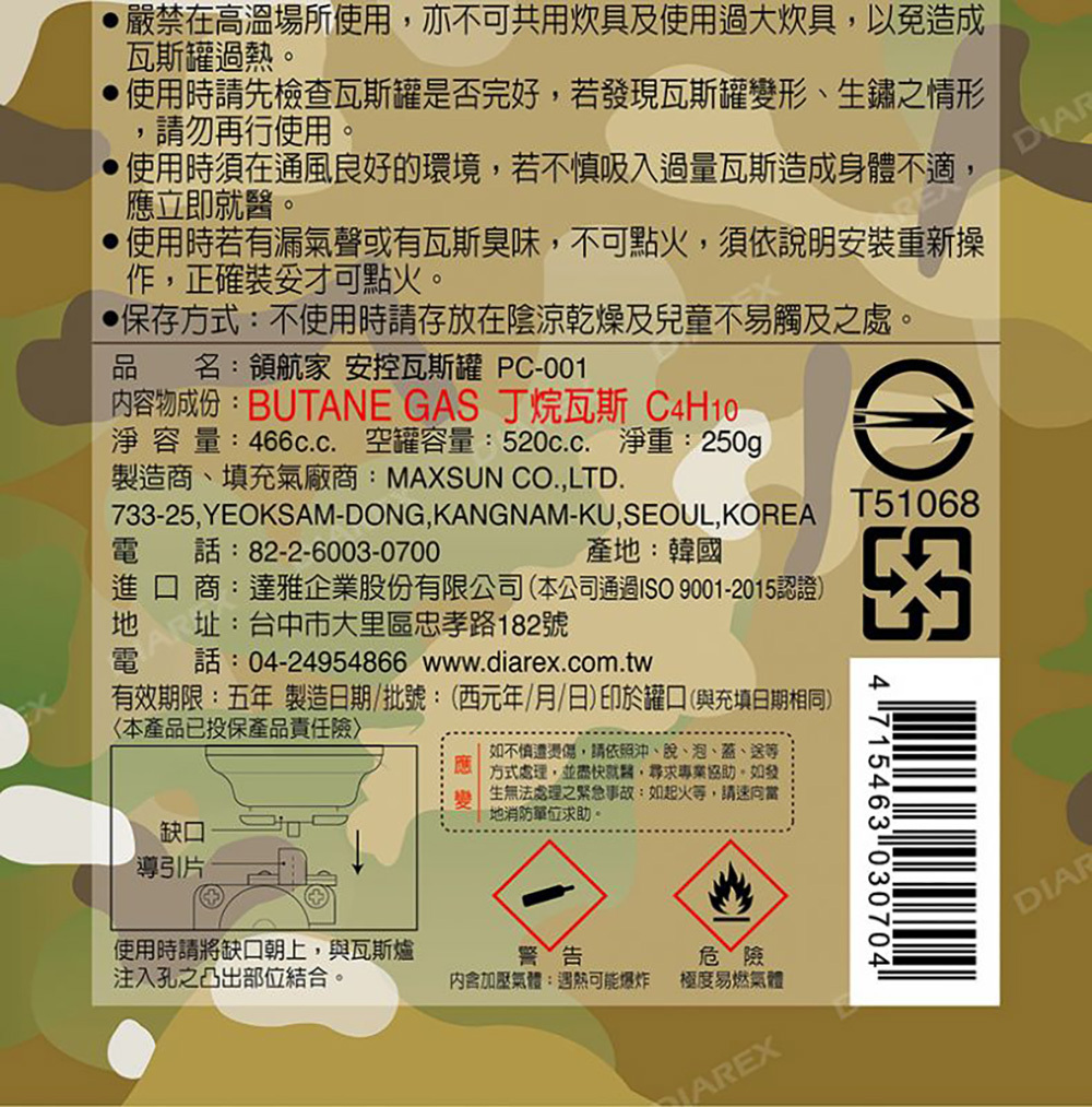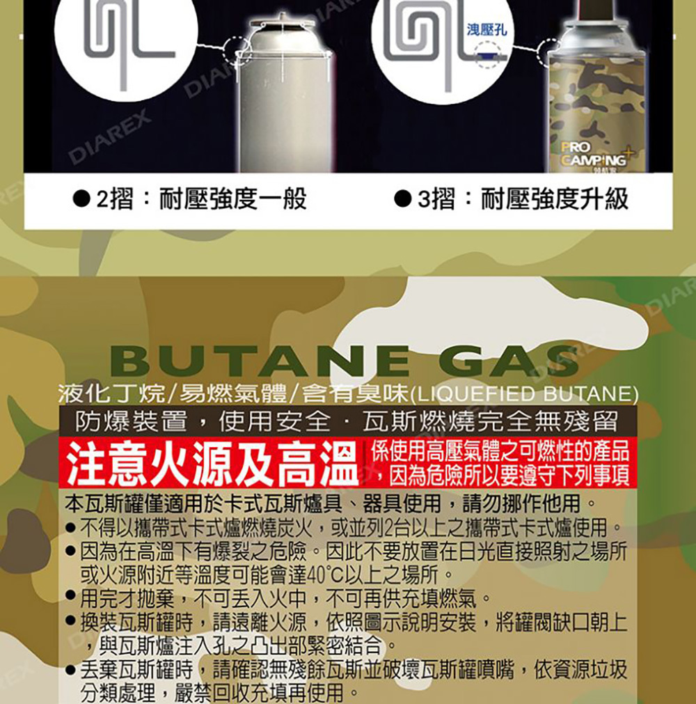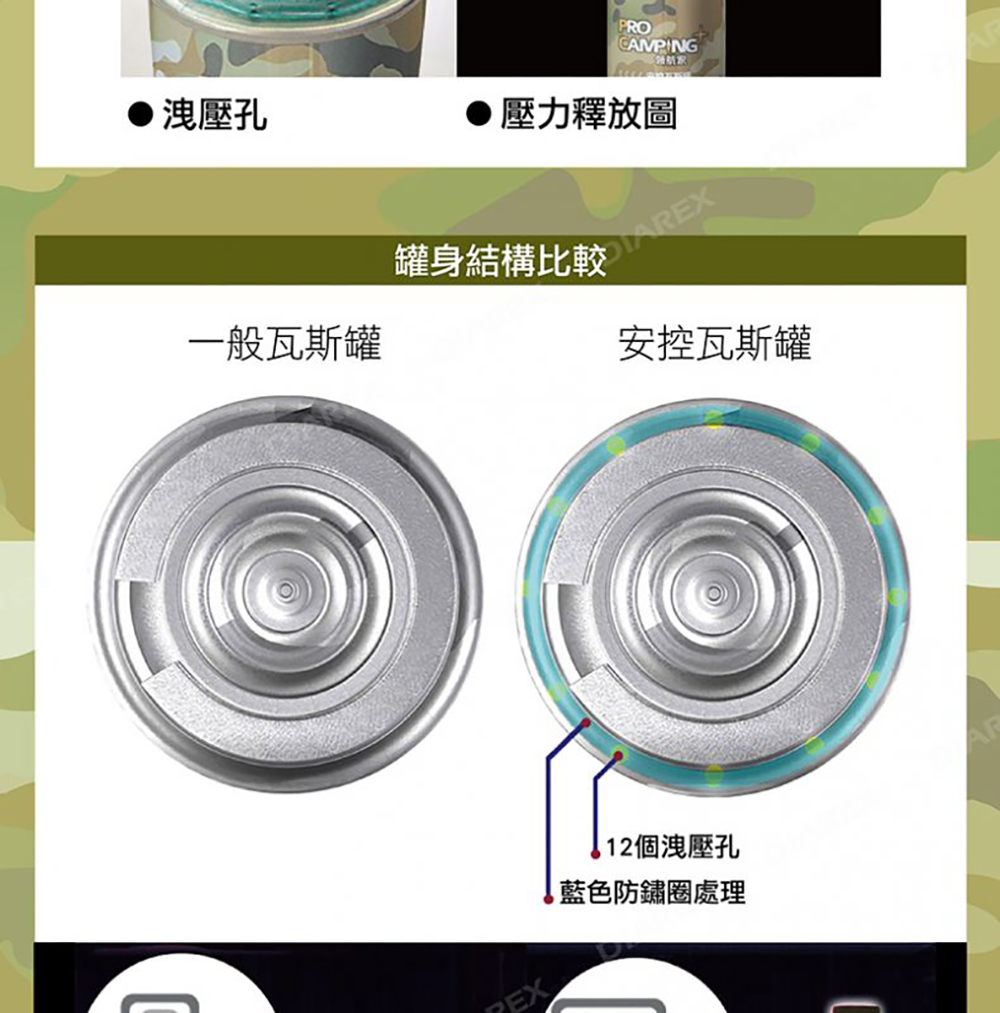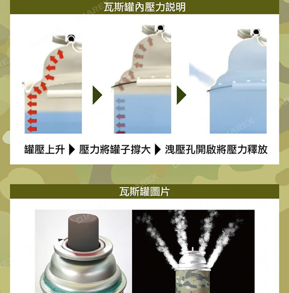 國際市場驗證合格安全瓦斯罐,雙安控多重保護、卡式瓦斯罐用途廣泛、迷彩塗裝更有風格。