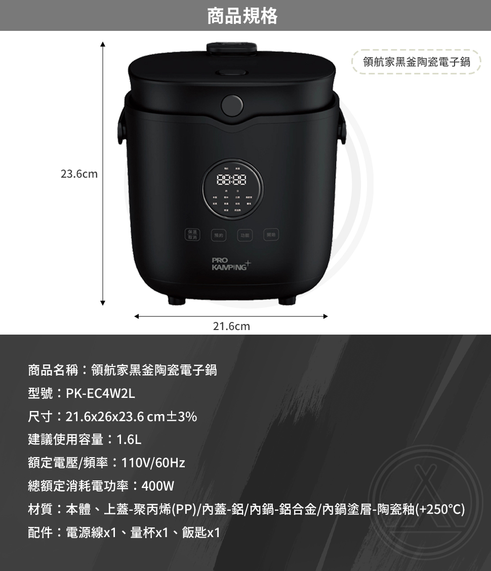 材質:本體、上蓋-聚丙烯(PP) / 內蓋-鋁 / 內鍋-鋁合金 / 內鍋塗層-陶瓷釉(+250℃)