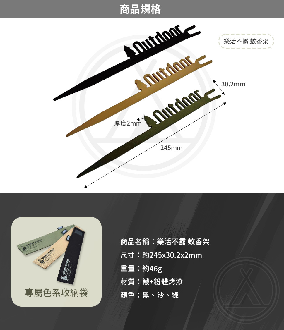 設計結合戶外象徵的樹木與"OUTDOOR"文字,打造出獨特的風格蚊香架。