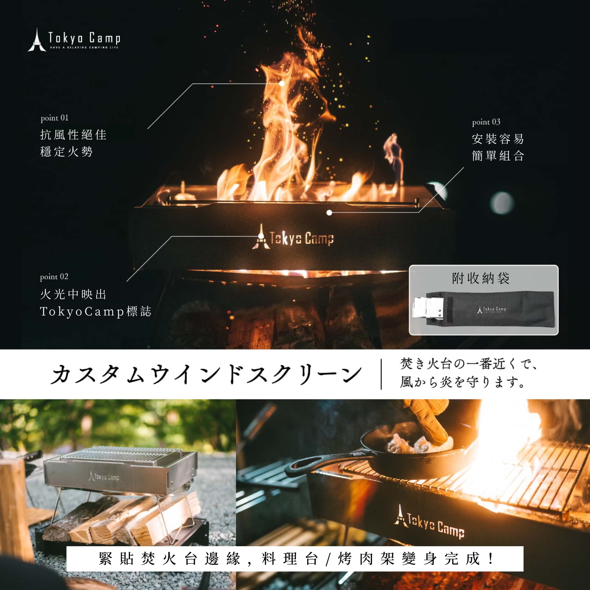 ・可貼近焚火台安裝、可折疊、附收納袋