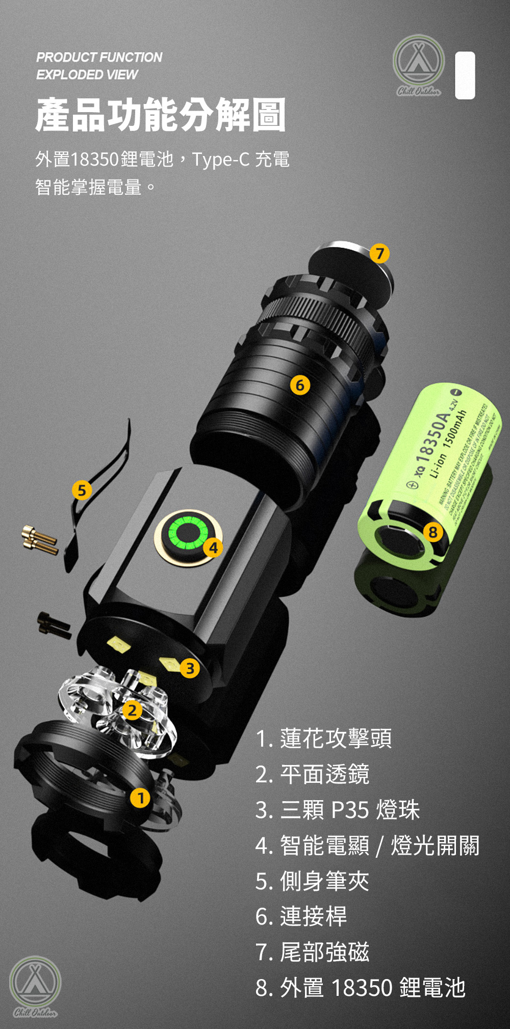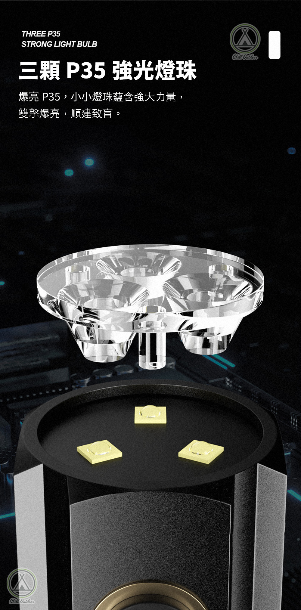 ✔ 採三顆P35強光燈珠,瞬間爆亮致盲