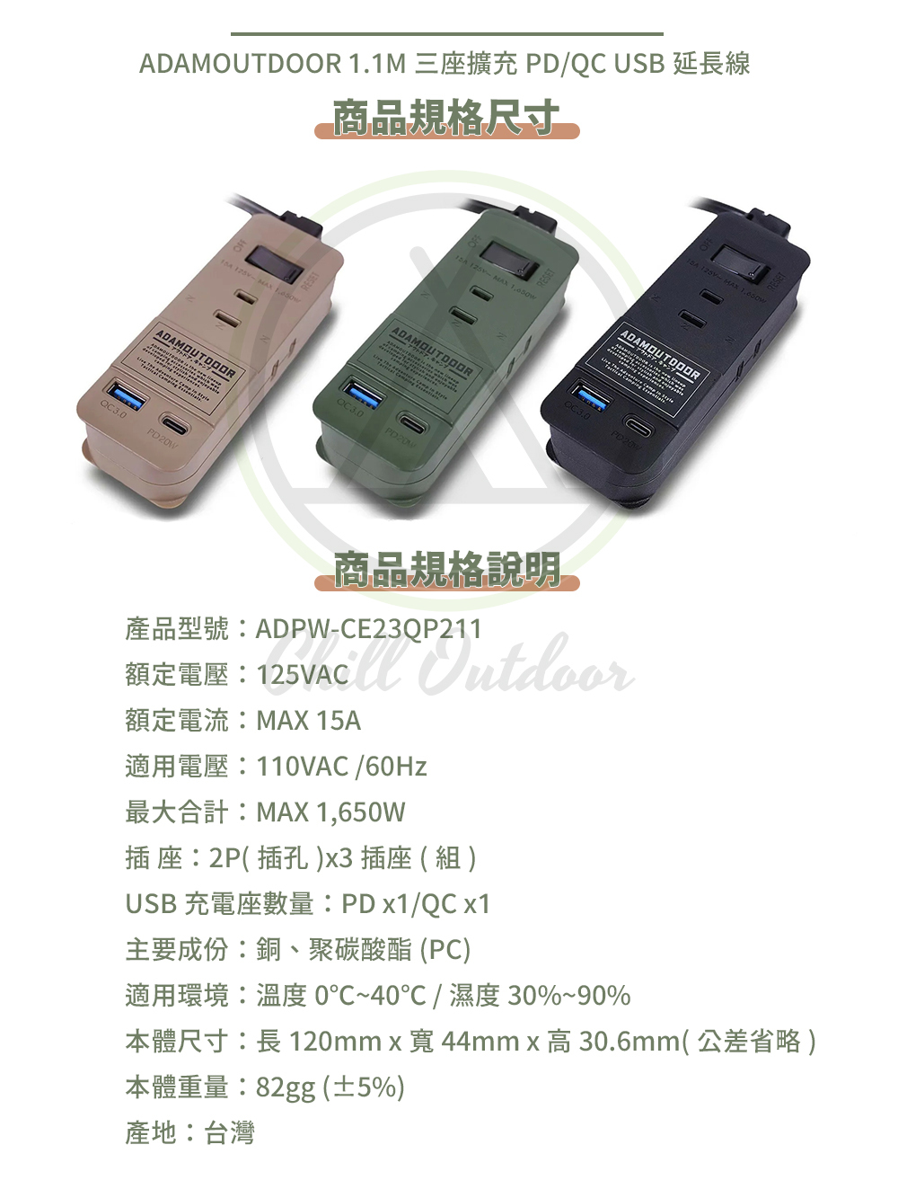 ADAMOUTDOOR 3座擴充PD/QC USB延長線 1.1M