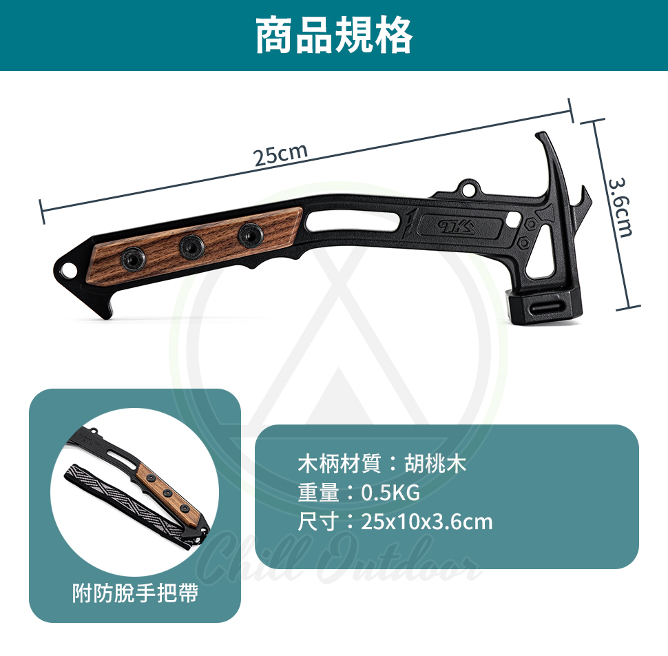 ✔採用SUS630不鏽鋼材質,堅固耐用✔重量僅500g,輕巧、迅速、好掌握,女生也能使用✔符合人體工學,握感舒適✔胡桃木握柄,硬度極高,質地細緻、色澤深邃、紋理分明✔槌頭頂端有開瓶器設計,實用方便✔附防脫手把帶,安全堅固,不易扯斷,防脫手,更放心施力